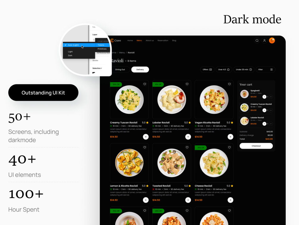 A top-tier Figma UI kit for food sites, packed with premiumness 50 Screens